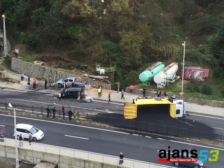 Çarpışmanın etkisi ile devrilen kamyonun kasasındaki asfalt yere savruldu. Otomobil sürücüsü K.S. ağır yaralanarak Recep Tayyip Erdoğan Üniversitesi Eğitim ve Araştırma Hastanesi'nde tedavi altına alındı. Rize Devlet Hastanesi'nde tedavi altına alınan kamyon sürücüsü H.A.'nın ise hafif yaralı olduğu öğrenildi.Kaza sonrası uzun süre trafik dururken, başka kazaların yaşanmaması için trafik polisleri yolda geniş güvenlik önlemleri aldı.