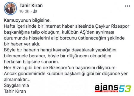 Tahir Kıran, sosyal medya hesabından “Kamuoyunun bilgisine” başlığıyla yayımladığı mesajda, “Hafta içerisinde bir internet haber sitesinde Çaykur Rizespor başkanlığına talip olduğum, kulübün AŞ’den ayrılması durumunda hisselerini alıp borcunu üstleneceğim şeklinde bir haber yer aldı.