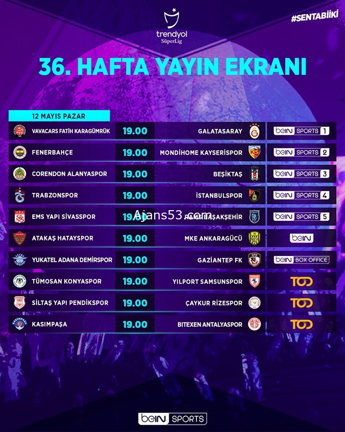 Süper ligin 36. haftasında yayıncı kuruluş BeIN Sport 7 maçı canlı olarak tv den yayınlayacak.