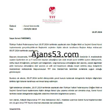Türkiye Futbol Federasyonu’ndan nisan ayında yapılan açıklamada, 31 Temmuz tarihine kadar yapılması gereken TFF Olağan Genel Kurul toplantısının, Türkiye A Milli Futbol Takımının EURO 2024 Finallerine katılmaya hak kazanması ve turnuvanın başlangıç ve bitiş tarihi de göz önüne alınarak, 18 Temmuz 2024 tarihinde seçimli olarak yapılmasına karar verildiği açıklandı. TFF Başkanlık seçimi, 18 Temmuz Perşembe günü gerçekleştirilecek.