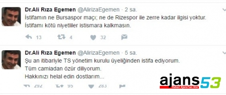 “Şu an itibariyle Trabzonspor yönetim kurulu üyeliğinden istifa ediyorum. Tüm camiadan özür diliyorum. Hakkınızı helal edin dostlarım. İstifamın ne Bursaspor maçı, ne de Rizespor ile zerre kadar ilgisi yoktur. İstifamı kötü niyetliler istismara kalkmasın."