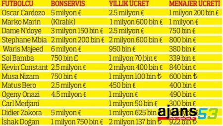 Oscar Cardozo... Benfica’ya bonservis ücreti olarak 5 milyon Euro ödendi. Yıllık 2.5 milyon Euro üzerinden 3 yıllık sözleşme imzalandı. Menajeri olan Gerardo Perez ne aldı? 1 milyon 200 bin Euro... Yani, Cardozo’nun aldığı ücretin yarı- sına yakını. Marko Marin... Chelsea’den kiralandı. Yıllık 1 milyon 600 bin Euro üzerinden sözleşme imzalandı. Liansports menajerlik şirketine ne ödendi? 1 milyon Euro... Neredeyse üçte ikisi! Dame N’doye... Hull City’ye fesih ücreti olarak 3 milyon 150 bin Euro verildi. Yıllık 2.5 milyon Euro üzerinden 3 yıllık sözleşme imzaladı. Yetersiz performansı nedeniyle ücreti 1 milyon 700 bin Euro’ya düşürüldü. Menajeri Nikolaj Sonne’ye ne verildi? 750 bin Euro.