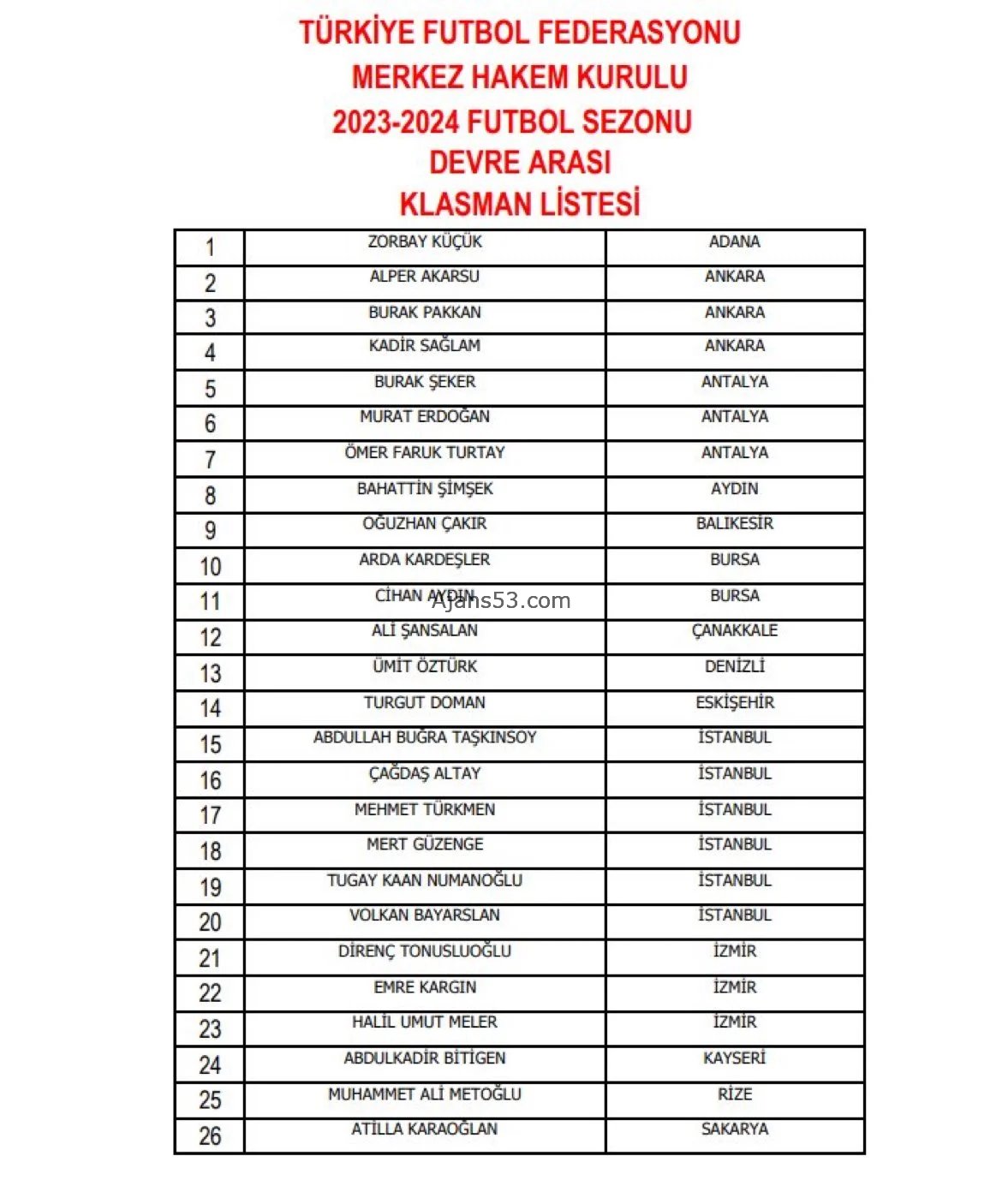 Öte yandan Süper Lig yardımcı hakem, A Klasman yardımcı hakem, B Klasman hakem ve yardımcı hakem ve B Klasman gözlemci listelerine de yer verildi.