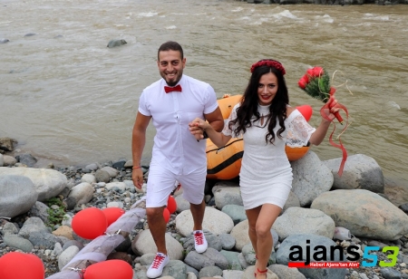 Rize'nin Ardeşen ilçesinde, rafting milli takım antrenörü Aydın Aksoy ile Gamze Terzioğlu, nikah törenlerine rafting botuyla geldi.