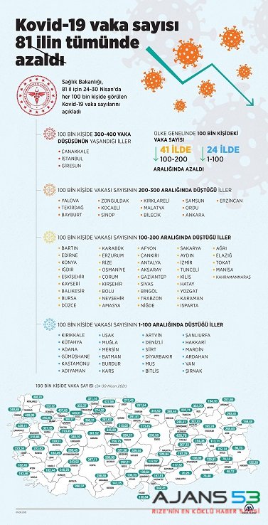 Ülke genelinde 41 ildeki vaka sayısında 100-200 aralığında düşüş yaşandı. Bu iller şöyle: