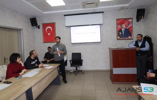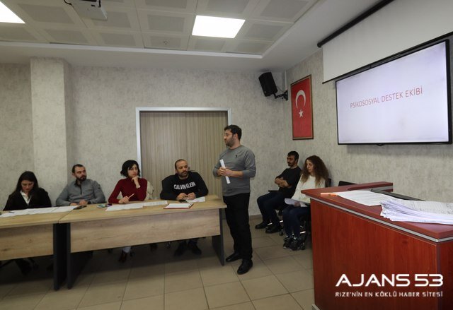 Rize’ye gelen depremzede vatandaşlar için kurulan Psikososyal Destek Ekiplerine Rize Sosyal Hizmet Merkezi Müdürü İlknur Demirtaş tarafından saha çalışmaları hakkında “Toplumsal Travmalara ve Afetlere Yaklaşım ve Psikososyal İlk Yardım” eğitimleri verildi.