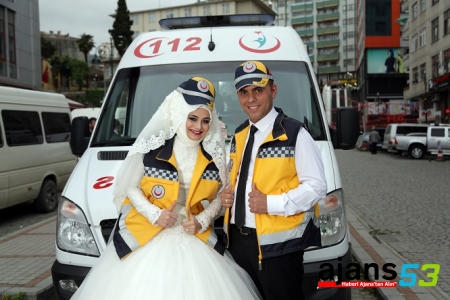 Düğün araçlarını yaşama yol ver sloganlarıyla süsleyen çift, İl Ambulans Servisi Başhekimliği önündeki acil yardım ambulansının önünde ve içinde dış mekan düğün fotoğraflarını çektirdi.