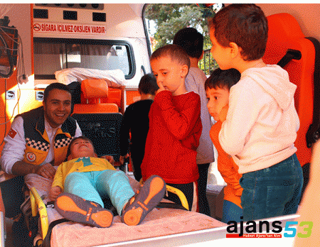 Salondaki bilgilendirme toplantısının ardından okulun bahçesinde düzenlenen etkinlikte ise ambulans ve ekipmanlarının nasıl kullanıldığı görevliler tarafından öğrencilere anlatıldı. Çocuklar, ambulansa binerek içindeki cihazları ve tıbbi donanımı yakından görme fırsatı buldu.