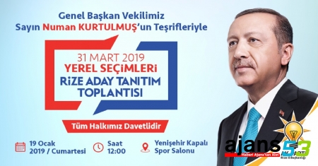 31 Mart 2019 tarihinde yapılacak yerel seçimlerde AK Parti’nin Rize’den aday göstereceği ilçe ve belde belediye başkan adaylarının açıklanacağı aday tanıtım programı AK Parti Genel Başkan Vekili Sayın Numan Kurtulmuş’un katılımıyla gerçekleştirilecek. Aday tanıtım programı 19 Ocak 2019 Cumartesi günü saat 12:00’da Rize kapalı spor salonunda gerçekleştirilecek.