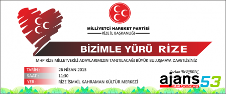 26 Nisan 2015 tarihinde saat : 11:30’da gerçekleşecek olan organizasyon Yerel bir televizyondan canlı olarak yayınlanacak ,MHP teşkilatı tüm Rize halkını davet ediyor.