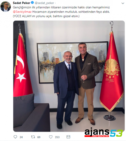 Şevki Yılmaz hakkında övgüyle bahseden Sedat Peker, Gençliğimizin ilk yıllarından itibaren üzerimizde hakkı olan hemşehrimiz Şevki Yılmaz Hocamızın ziyaretinden mutluluk, sohbetinden feyz aldık. (YÜCE ALLAH’ım yolunu açık, bahtını güzel etsin.)" dedi.