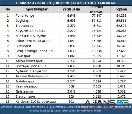 Medya Takip Merkezi (MTM), Türkiye Spor Yazarları Derneği için hazırladığı Temmuz ayı raporunu açıkladı. Rapora göre Temmuz ayında futbol kulüpleri içinde en çok Fenerbahçe konuşulurken, Çaykur Rizespor listede yer almadı..