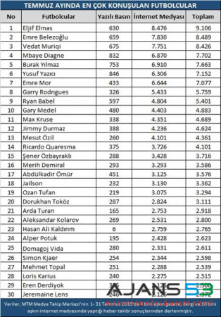 Medya Takip Merkezi’nin aynı raporuna göre spor basınında 15 bin 884 haberde yer alan imparator, Temmuz ayının kendinden en çok söz ettiren teknik patronu oldu. Yeni sezona mutlak şampiyonluk parolasıyla giren Fenerbahçeli teknik direktör Ersun Yanal ise 14 bin 597 haber ile bu listenin ikinci sırasında yer aldı. Beşiktaş’ın yeni antrenörü Abdullah Avcı ise kendisine üçüncü sıradan yer buldu.