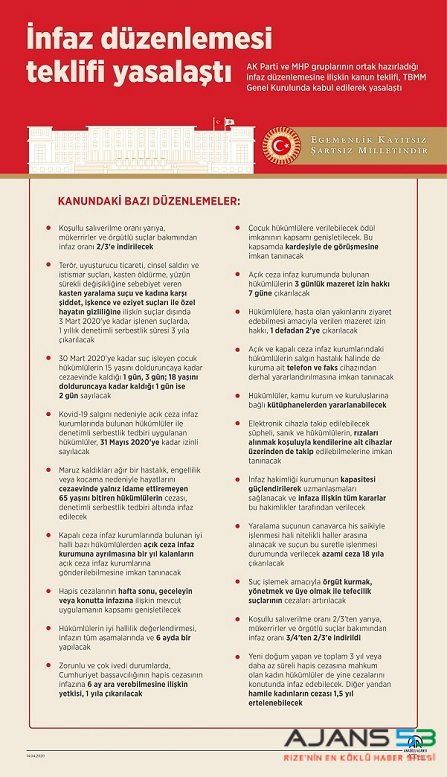 Yeni tip koronavirüs salgını nedeniyle açık ceza infaz kurumlarında bulunan hükümlüler ile denetimli serbestlik tedbiri uygulanan hükümlüler, 31 Mayıs 2020’ye kadar izinli sayılacak. Salgının devam etmesi halinde bu süre 2 aylık sürelerle 3 kez uzatılabilecek.