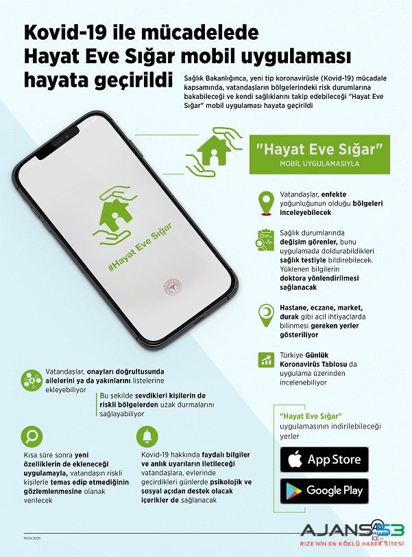 Sağlık Bakanlığınca, yeni tip koronavirüsle (Kovid-19) mücadale kapsamında, vatandaşların bölgelerindeki risk durumlarına bakabileceği ve kendi sağlıklarını takip edebileceği "Hayat Eve Sığar" mobil uygulaması hayata geçirildi.