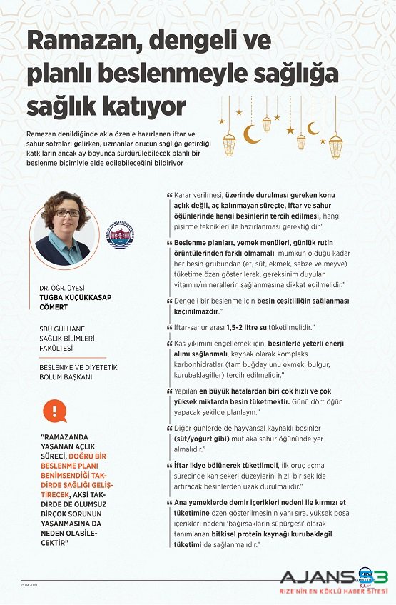 Sağlık Bilimleri Üniversitesi (SBÜ) Gülhane Sağlık Bilimleri Fakültesi Beslenme ve Diyetetik Bölüm Başkanı Dr. Öğr. Üyesi Tuğba Küçükkasap Cömert, AA muhabirine, ramazanda sağlıklı ve dengeli beslenmeye ilişkin değerlendirmede bulundu.