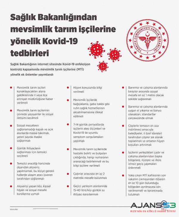 Sağlık Bakanlığınca, yeni tip koronavirüs (Kovid-19) enfeksiyon kontrol önlemleri kapsamında, mevsimlik tarım işçilerinin (MTİ) seyahatleri, konaklayacakları alanlar ve temel ihtiyaçlarının giderilmesine dair tedbirler güncellendi.