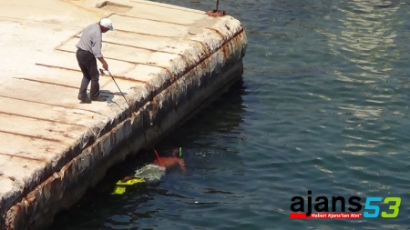 Hava sıcaklığının 40 dereceyi bulduğu Çanakkale’de, bir vatandaş motor iskelesinden denize girdi. Şnorkelle dalış yapan ve su altından ilerleyen kişi, kıyıda balık tutan bir başka vatandaşın oltasına takıldı. Dalgıca zarar gelmemesi için uyarmaya çalışan vatandaş, sesini duyuramayınca, elinde olta ile iskele boyunca dalgıcı takip etmeye başladı. Bir süre sonra oltanın ucuyla dürterek, hiçbir şeyden habersiz yüzen dalgıcın dikkatini çekmeyi başaran vatandaş, oltasını kurtarmak istedi. Su altındaki kişi de oltayı çıkarmak istese de başarılı olamayınca, yüzmeye devam etti. Balıkçı, çaresizce dalgıcın peşinden gitmeye devam ederken, olta kendiliğinden kurtuldu. Balıkçı oltasını alarak iskeleden ayrılırken, dalgıç ise hiç bir şey olmamış gibi yüzmeye devam etti.