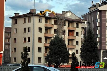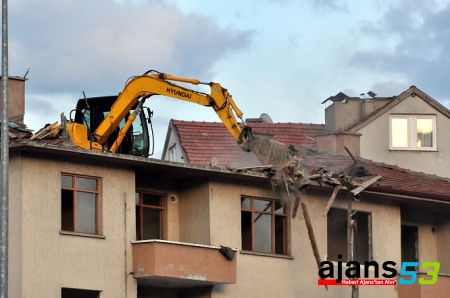İnönü Mahallesi Ilgaz Sokak'ta kentsel dönüşüm kapsamında 30 yıllık 6 katlı binanın yıkılması için çalışma başlatıldı. Yıkım işlemini gerçekleştirecek firma, paletli kepçeyi vinç yardımıyla binanın en üst katına çıkarttı.