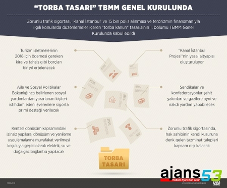 Zorunlu trafik sigortası, 'Kanal İstanbul' ve 15 bin polis alınması ve terörizmin finansmanıyla ilgili konularda düzenlemeler içeren "torba kanun" tasarısının 1. bölümü TBMM Genel Kurulunda kabul edildi. Önceki Haber Sonraki Haber