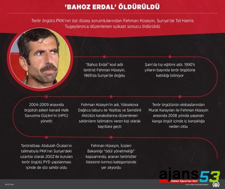 Suriye'de öldürülen terör örgütü PKK'nın elebaşılarından "Bahoz Erdal" kod adlı Fehman Hüseyin, İçişleri Bakanlığı ödül yönetmeliği kapsamında aranan teröristler listesindeki kırmızı kategoride yer alıyordu. Önceki Haber Sonraki Haber