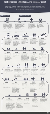 AA muhabirinin derlediği bilgilere göre, 15 Temmuz Cuma günu saat 22.00'de başlayan FETÖ'nün darbe girişimi, 16 Temmuz Cumartesi gunü saat 20.02'de bertaraf edildi. FETÖ'nün darbe girişimi ile ardından yaşanan gelişmeler şöyle:
