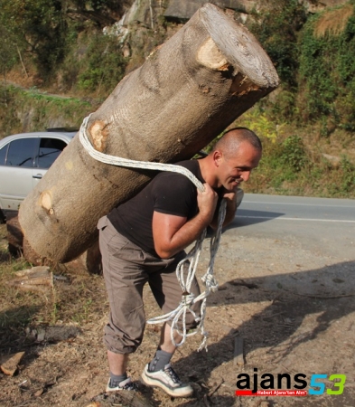 - 'Rambo' lakaplı Ramazan Çepni, 203 kilo olarak tartılan ağaç kütüğünü sırtında taşımayı başardı