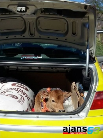 Sarıkız ismi verilen ve hastalanan buzağı, veterinerde tedavi olduktan sonra sahibi tarafından otomobilin arka koltuğuna bindirilerek eve götürüldü. Buzağının taksinin bagajındaki yolculuğu görenleri şaşırttı.